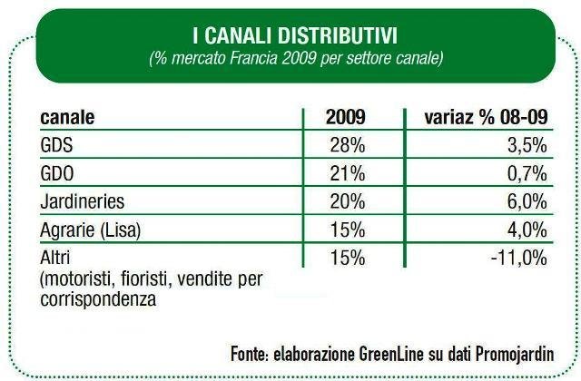 Dall'analisi dei canali distributivi emerge lo strapotere della grande distribuzione, che controlla quasi il 50% delle vendite: per la precisione la Grande Distribuzione Alimentare ha veicolato il 21% delle vendite e le Grandi Superfici Bricolage il 28%. I garden center (jardineries) e le agrarie (in Francia si chiamano Lisa, cioè 'libero servizio agricolo') hanno sviluppato rispettivamente il 20% e il 15% delle vendite. É interessante però segnalare che i canali specializzati sono quelli che sono cresciuti di più: le jardineries del 6% e le Lisa del 4%.