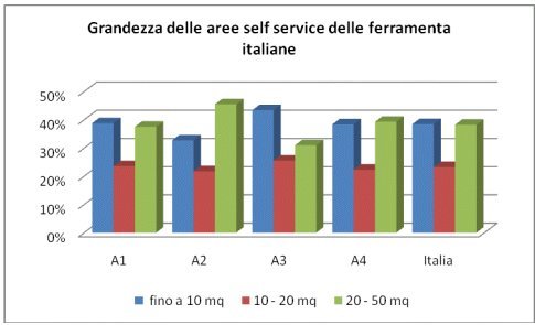 In Italia la quota di ferramenta che dispongono, all’interno del punto vendita, di un’area a libero servizio è piuttosto elevata: In base alle rilevazioni di M&T, più di una ferramenta su tre è strutturata in questo modo, in particolare nelle regioni del centro Italia e del nord-est. L'ampiezza di tale area è di meno di 10 metri quadrati nel 38,5% dei casi, di 10-20 metri quadrati nel 23,3% delle ferramenta e si estende, per la quota rimanente del 38,3%, su una superficie dai 20 ai 50 metri quadrati.