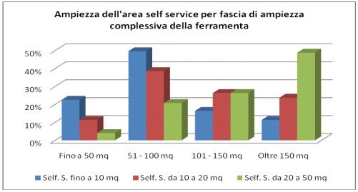 Considerando, infine, la classe più alta di grandezza dell'area self-service, da 20 a 50 metri quadrati, i dati di Marketing & Telematica offrono una valida conferma numerica di quanto è facile supporre: aree self-service di grandi dimensioni compaiono nelle ferramenta di meno di 50 mq solo nel 4% dei casi e nei negozi che superano i 150 metri quadrati in quasi un caso su due. È interessante notare che le ferramenta di dimensioni medio-piccole, dai 51 ai 100 metri quadrati complessivi di superficie, in un caso su 5 hanno destinato a self-service un'area cospicua del negozio.