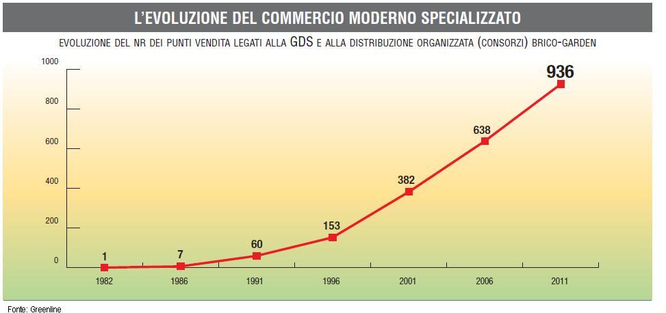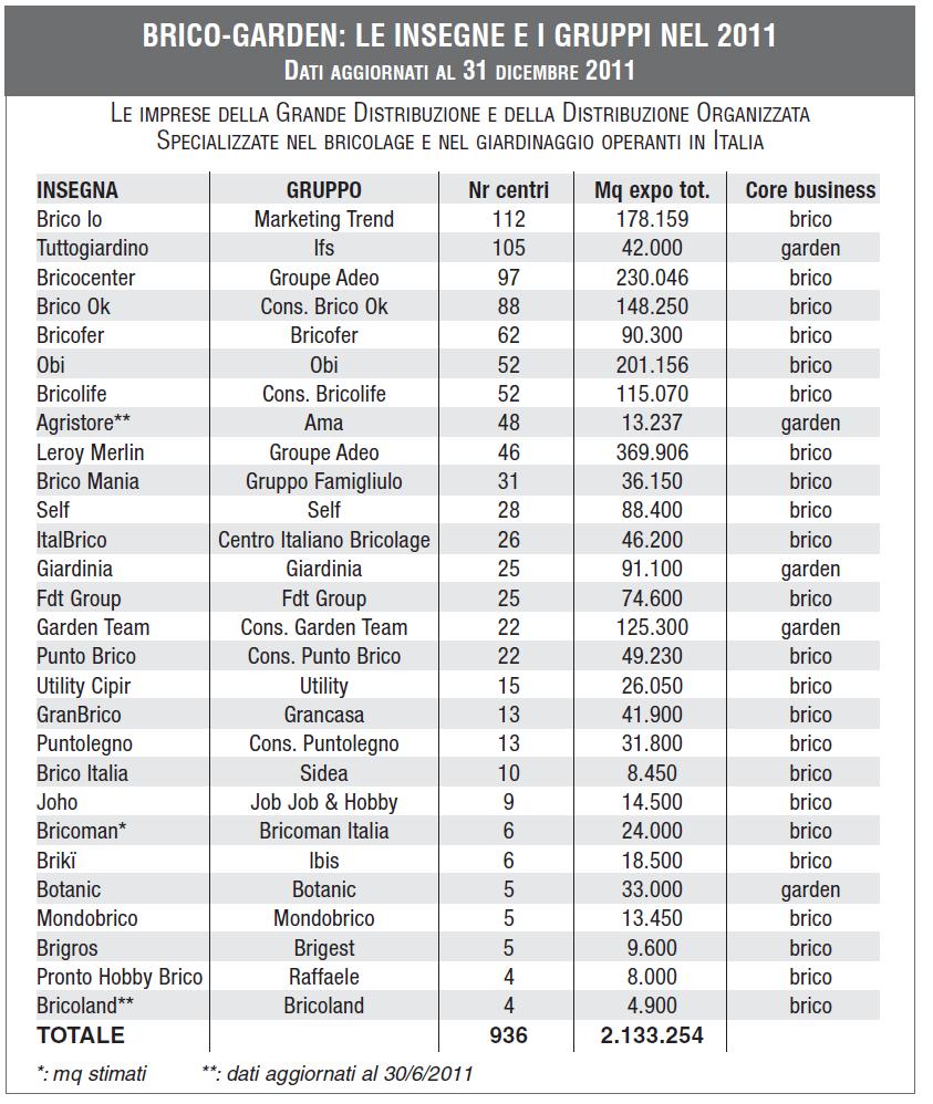 Analizzando i core business possiamo rilevare un aumento di importanza del "mondo garden": il 78% dei punti vendita totali sono centri bricolage, con 731 negozi (+1,5%) e 1.828.617 mq (+7,3%), mentre il restante 22% è rappresentato dai centri giardinaggio, con 205 punti vendita (+26,5% rispetto ai 162 del 2010) e 304.637 mq (+14%).