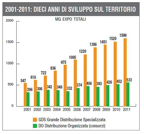 Al 31 dicembre 2011 i negozi legati alle insegne della GDS erano 751 (+5,6%) con 1.599.954 mq (+5,3) mentre quelli della DO sono 185 (+8,2) con 533.300 mq (+18%).