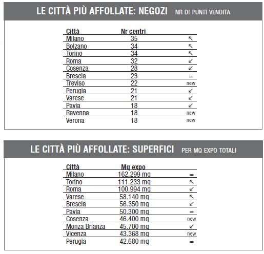 Milano torna in testa alla classifica delle città più "affollate", dopo il sorpasso di Roma del 2010. Il capoluogo lombardo ha 35 centri, seguito da Bolzano e Torino con 34 e Roma con 32. La maggiore superficie espositiva spetta ancora a Milano (162.299 mq), seguita da Torino (111.233 mq) e Roma (100.994): sono le uniche città che hanno superato il "muro" dei 100.000 mq e distanziano nettamente la quarta, Varese con 58.140 mq.