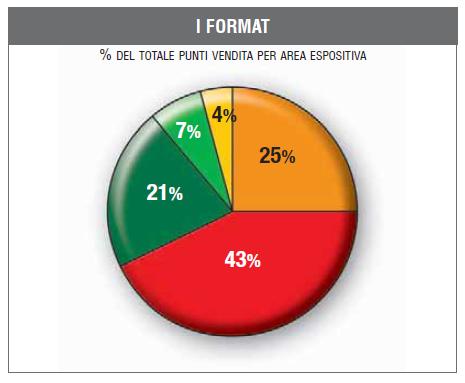 Le Regioni più "affollate" (sia per numero di negozi sia per superficie espositiva) sono la Lombardia (161), il Piemonte (100) e il Veneto (87).
