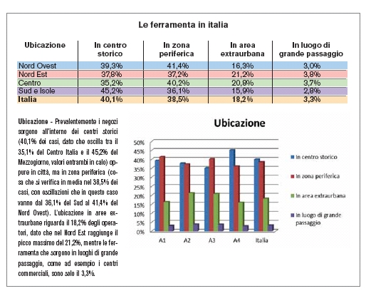 Ubicazione - Prevalentemente i negozi sorgono all’interno dei centri storici (40,1% dei casi, dato che oscilla tra il 35,1% del Centro Italia e il 45,2% del Mezzogiorno, valori entrambi in calo) oppure in città, ma in zona periferica (cosa che si verifica in media nel 38,5% dei casi, con oscillazioni che in questo caso vanno dal 36,1% del Sud al 41,4% del Nord Ovest). L’ubicazione in aree extraurbane riguarda il 18,2% degli operatori, dato che nel Nord Est raggiunge il picco massimo del 21,2%, mentre le ferramenta che sorgono in luoghi di grande passaggio, come ad esempio i centri commerciali, sono solo il 3,3%.