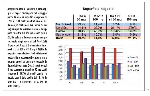 Ampiezza aree di vendita e stoccaggio - I negozi dispongono nella maggior parte dei casi di superfici comprese tra i 50 e i 100 metri quadrati (nel 41,3% dei casi, in particolare nel Centro Italia); seguono poi le ferramenta che si sviluppano su oltre 150 mq (che sono pari al 21,1%, valore in lieve aumento e sempre sostenuto dagli esercizi del Nord Est). Dispone poi di spazi di dimensione intermedia, tra i 100 e i 150 mq, il 17,8% dei negozi (valore stabile a livello italiano rispetto alla precedente rilevazione, ma si nota un calo di un punto percentuale del dato relativo al Nord Ovest) mentre quelli che coprono al massimo 50 mq costituiscono il 19,7% di quelli censiti (in questo caso il dato oscilla dal 14,1% del Nord Est - in aumento - al 23,9% del Nord Ovest). L’ampiezza prevalente del magazzino resta inferiore ai 100 metri quadrati, in quasi il 60% dei casi, e restano lievi le oscillazioni di pochi punti percentuali tra le quattro macro aree del Paese; in un caso su quattro lo spazio deputato a stoccaggio delle scorte si estende fino a 300 metri quadrati (con una frequenza lievemente minore nelle regioni del Centro), mentre a disporre di spazi più grandi è complessivamente il 15% delle ferramenta. Per la precisione, il 7,4% arriva a 600 mq (dato in lievissimo calo) e il 7,3% va oltre. In lieve aumento le ferramenta che dispongono anche di uno spazio per la vendita a libero servizio, oggi il 62% del totale. Quando è presente, l’area self ha dimensioni contenute (fino a 10 mq) nel 37,9% dei casi, medie (da 10 a 20 mq) nel 23,2% delle ferramenta, grandi (da 20 a 50 mq) nel 38,9% dei casi (da rilevare la riduzione del peso degli operatori con self service ampi nelle regioni del Nord Est e l’aumento in quelle del Sud).