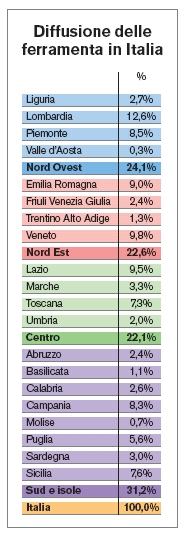 L’ultima rilevazione di M&T ha censito sul territorio italiano 8.840 ferramenta attive: il 31,2% di esse sorge al Sud e nelle Isole, il 24,1% al Nord Ovest, il 22,6% al Nord Est e il 22,1% nel Centro Italia, con una concentrazione particolarmente rilevante in Lombardia (12,6%) Veneto (9,8%), Lazio (9,5%) ed Emilia Romagna (9%).