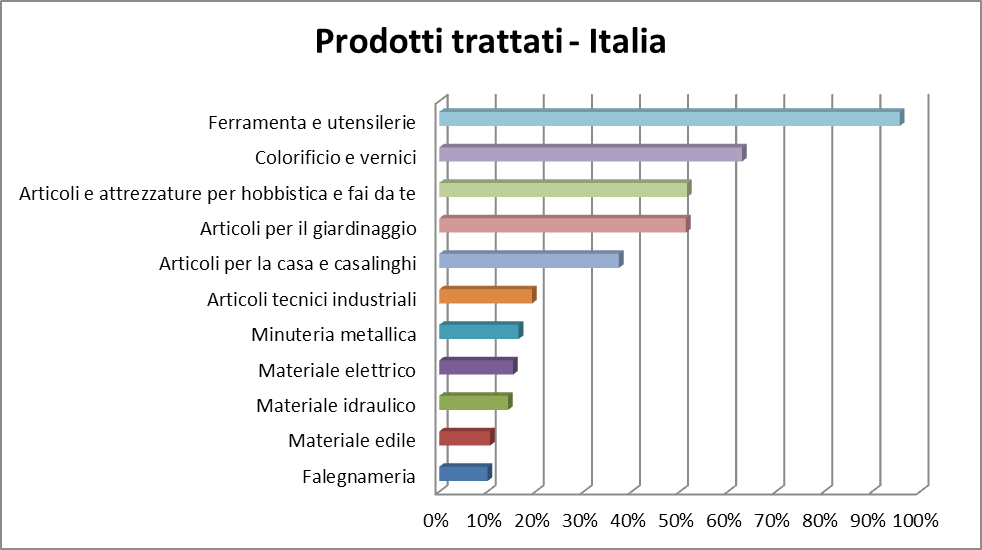 · FALEGNAMERIA: è trattata dal 9% degli operatori in Centro Italia e nel Nord Ovest, dal 10,2% di essi nel Nord Est e dall'11% dei punti vendita nel Mezzogiorno.