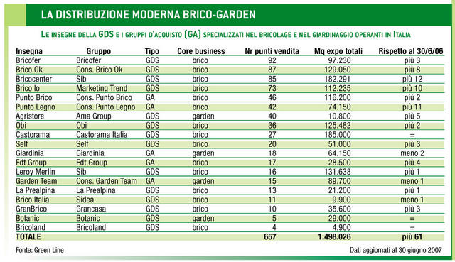 | Per fotografare il commercio moderno specializzato nel bricolage e nel giardinaggio operante in Italia abbiamo selezionato le insegne della GDS (Grande Distribuzione Specializzata) e i gruppi d’acquisto riconosciuti dal Codice Civile (cioè i consorzi e le unioni volontarie). Sono state volontariamente escluse le società di trading, i grossisti, le centrali d’acquisto e le società che offrono servizi ai singoli punti vendita senza operare in una logica d’insegna (marchio comune, assortimenti comuni, comunicazione congiunta, ecc.). Le superfici espositive indicate sono relative alle aree destinate alla vendita; sono quindi esclusi i parcheggi, gli uffici e i magazzini. Tutti i dati sono stati forniti dalle stesse insegne ed elaborati dall’autore. |