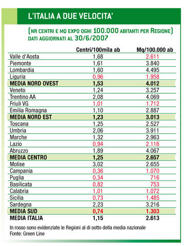Va detto che il cammino è appena iniziato e che le Regioni del centro sud sono ancora poco “percorse” rispetto alle Regioni del centro e del nord: a questo proposito è interessante notare che il rapporto della superficie espositiva ogni 100.000 abitanti è esattamente la metà della media nazionale: 2.613 mq ogni 100.000 ab è la media italiano, contro i 1.303 mq del sud.