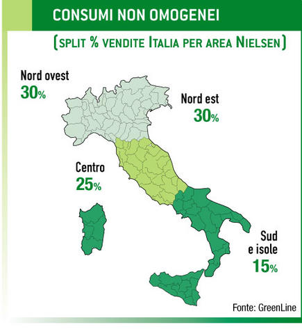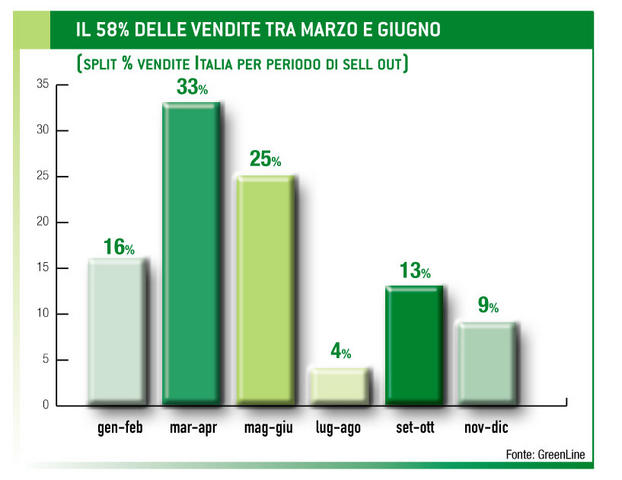 Che l’Italia dei consumi sia sbilanciata verso nord non è un fatto che stupisca: per la precisione la ripartizione è 30% nord ovest, 30% nord est, 25% centro e 15% sud. Abbastanza intuitiva anche la forte stagionalità delle vendite, che per quasi due terzi è concentrata da marzo a giugno: infatti il 16% è venduto tra gennaio e febbraio, il picco del 33% si tocca tra marzo e aprile, cui si aggiunge il 25% di maggio e giugno; il cuore dell’estate segna una battuta di arresto, col 4% di luglio-agosto; una piccola ripresa si ha a settembre-ottobre col 13%, mentre il restante 9% viene venduto negli ultimi due mesi dell’anno.