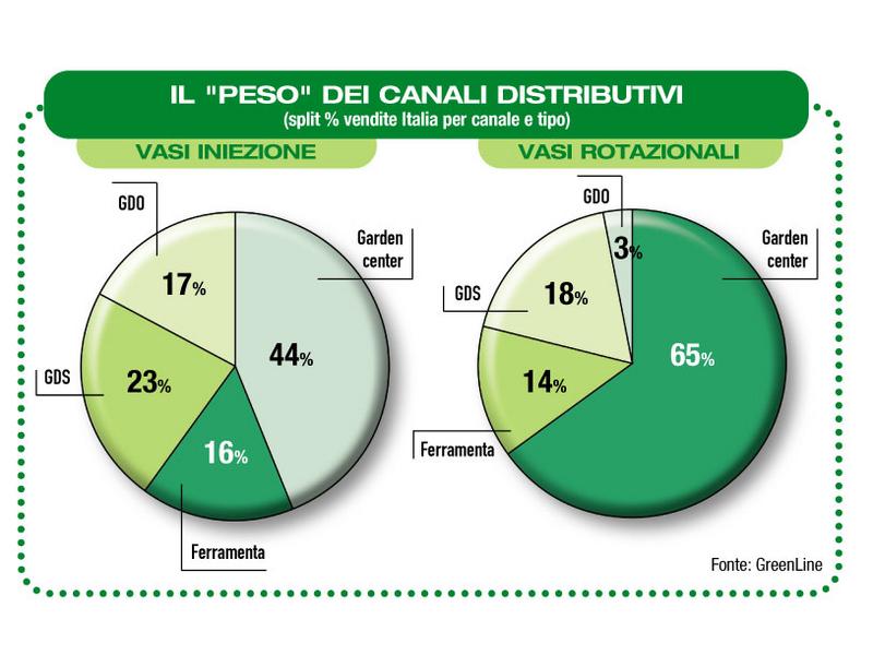 Al rotazionale, sempre più simile per aspetto alla terracotta, si attribuisce evidentemente un “valore aggiunto” in termini di stile che traspare dall’analisi dei canali di vendita: garden 65%, ferramenta 14%, Gds 18%, Gdo 3%. I valori cambiano se si passa ai vasi a iniezione: garden 44%, ferramenta 16%, Gds 23%, Gdo 17%.
