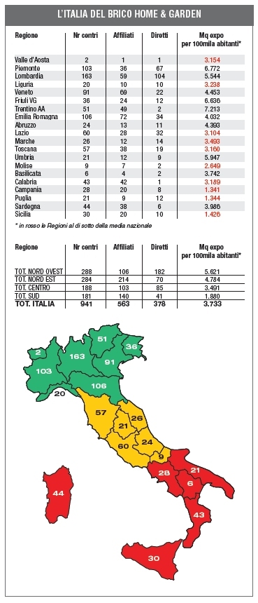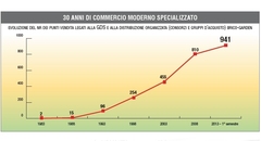 Se spostiamo l’attenzione verso i core business dei punti vendita (centri bricolage o centri giardinaggio), vediamo come questa diminuzione sia attribuibile a entrambi i “mondi”: i centri diy che sono passati dai 718 negozi del 2012 ai 709 attuali (-1,3%) e i garden center sono passati da 237 punti vendita di fine 2012 ai 232 attuali (-2,1%). La causa è determinata dalla diminuzione della rete di negozi di alcuni gruppi nel primo semestre 2013 (come BricoOk, Fdt Group, Brico Mania e Giardinia) e dalla cessazione di attività - alla fine del 2012 - del consorzio Punto Brico con 19 negozi. Una perdita, quest’ultima, parzialmente colmata nel nostro Monitoraggio dai 10 negozi Brico Point di Defì Brico: ex affiliato Punto Brico e analizzato come realtà indipendente per la prima volta in questa analisi.