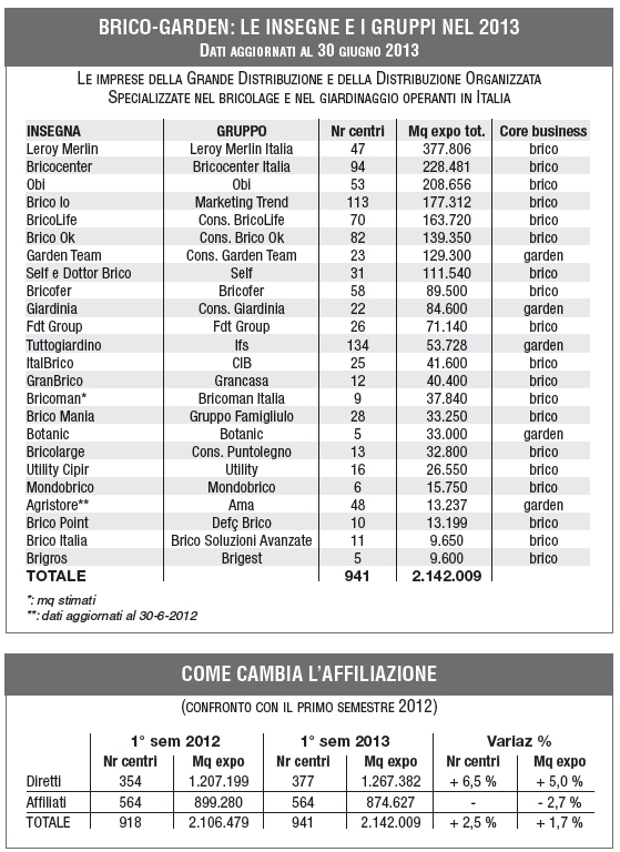 Tra le novità più significative del primo semestre del 2013, ricordiamo l’inaugurazione il 2 maggio della nuova insegna Abc (Abitare, Bricolare & Co) ad Amaro (in provincia di Udine, nell’ex centro brico Joho), promossa dalla collaborazione tra Defì Brico e Fraschetti Distribuzione. Si tratta di un primo centro pilota, su cui si baserà la riconversione dei centri Brico Point, con l’obiettivo di creare una nuova insegna attiva con centri diretti e in franchising. Da segnalare il terzo punto vendita dell’insegna Progress, promossa da A.Capaldo, attiva oggi con 3 negozi ad Avellino (Atripalda e Passo di Mirabella) e Caserta con 5.100 mq totali. Precisiamo che quest’ultima insegna non è stata inserita nel nostro Monitoraggio poiché analizziamo solo i gruppi con almeno 5 punti vendita; per la stessa ragione non trovate insegne come Giardineria (3 centri), Peraga Garden Center (3) e Pronto Brico Hobby (4) pur essendo oggetto della nostra indagine. Tra le insegne già attive merita una menzione BricoLife che ha registrato ben 12 nuove aperture, grazie all’affiliazione di Free Time a Foggia e di Unipam/Orizzonte con 11 punti vendita nel Lazio. Una crescita stemperata dall’uscita di Bricolage Cristofoli (4 negozi nel Triveneto). Impossibile infine non citare Bricoman, la catena della francese Adeo entrata in Italia nel 2008, che con politiche di prezzo aggressive e un format innovativo sta rapidamente conquistando i bacini d’utenza nei quali opera. Nel 2013 è tornata ad aprire 2 negozi all’anno, come era successo nel 2010 (Sassari e Milano) e nel 2011 (Ferrara e Catania) e dopo la pausa del 2012 (“solo” Carate Brianza). Quest’anno segnaliamo le nuove aperture di Parma e il debutto di Bricoman in Puglia, per la precisione a Cavallino in provincia di Lecce. Un unico rimprovero a Bricoman: non forniscono le metrature dei singoli punti vendita, come invece fanno tutti gli altri gruppi. Perciò le metrature indicate in questo Monitoraggio sono stimate, in seguito a un sopralluogo nei punti vendita.Cala l’affiliazione?