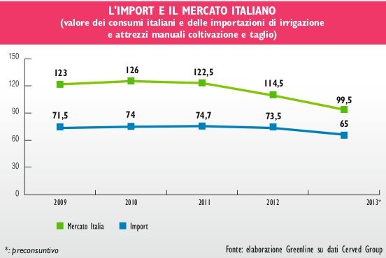 Per curiosità statistica ho consultato il mio archivio per risalire nel tempo a dati di consumo simili e sono arrivato al 2003, dieci anni fa esatti, quando l’irrigazione fatturava 49,7 milioni e la coltivazione 23,6. Per il settore degli attrezzi da taglio bisogna risalire oltre: nel 2003 già fatturava 29,1 milioni di euro contro i 25,3 del 2013. Ma raffrontando le analisi Databank Cerved del 2003 e del 2013 c’è un altro dato che spicca: le imprese “rilevanti” sono passate da 80 a 42, con un’occupazione scesa da 800 addetti a 420. Gli effetti della globalizzazione e della crisi, hanno determinato in questi ultimi anni fenomeni di concentrazione industriale: nel 2013 le prime 4 imprese sviluppavano il 35,4% del giro d’affari totali, oggi il 49,5% (e le prime 8 il 59,6%). Senza dimenticare l’aumento delle importazioni: nel 2013 i prodotti esteri rappresentavano il 56,7% delle vendite totali in Italia, oggi sia saliti al 65,3% (vedere grafico L’import e il consumo italiano). Anche se va detto che nel 2013 sono diminuite anche le importazioni dell’11,6%, dopo il -1,6% del 2012. “Il 2013 è stato particolarmente sfavorevole per l’andamento meteorologico e per le difficoltà che si trovano ad affrontare i consumatori italiani – spiega Lorena Piazza, amministratore di Officine Piazza nota per il marchio Handy -. Noi manteniamo la produzione in Italia con la consapevolezza di tutelare il nostro mercato, i lavoratori e le nostre imprese. Ma ogni giorno sugli scaffali, nei negozi, troviamo sempre più prodotti a basso costo provenienti da paesi in cui non viene rispettata nessuna regola sui diritti civili, sulla sicurezza del lavoro, sui diritti sindacali, sul rispetto dell’ambiente. Dobbiamo andare verso una manifattura globalmente responsabile, etica e sicura, a tutela dei nostri mercati, dei lavoratori, delle nostre imprese”. In merito al futuro, il Rapporto Databank Cerved dice che “nel 2014 si prevede un assestamento del mercato sui valori raggiunti, con un allineamento delle due aree d’affari su un trend di lieve crescita, che corrisponde a incrementi molto modesti di valore. Questa previsione, basata sull’attesa di un leggero recupero degli acquisti per sostituzione e rinnovo, è tuttavia condizionata dall’andamento meteorologico imprevedibile che caratterizza gli ultimi anni”. “Abbiamo segnali incoraggianti per la prossima stagione – spiega Antonio Scopazzo, responsabile vendite di Escher – anche se siamo consapevoli che l’attuale congiuntura economica non permetterà di recuperare tutto quello che si è perduto negli ultimi due anni”.