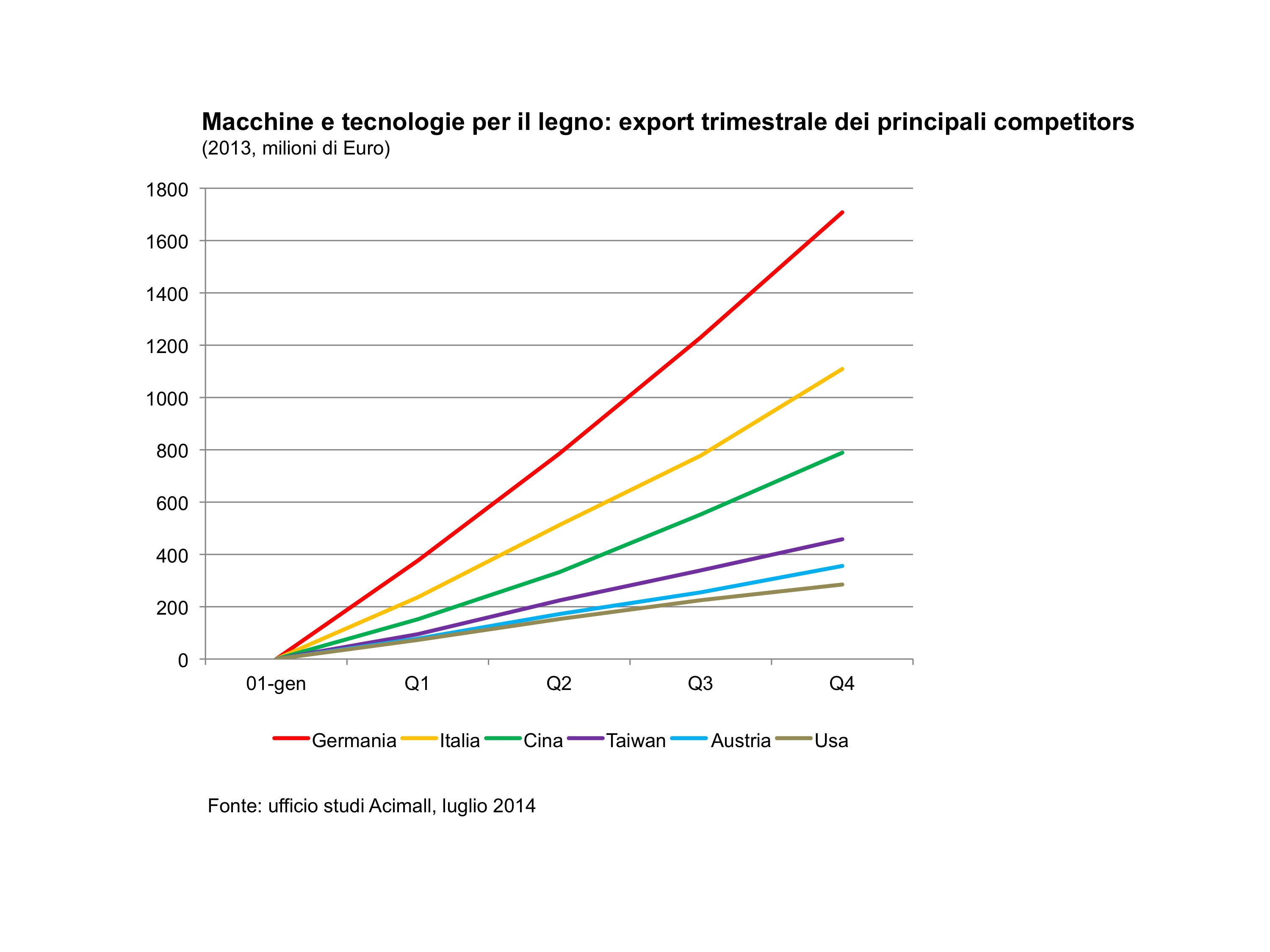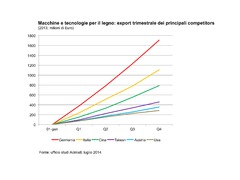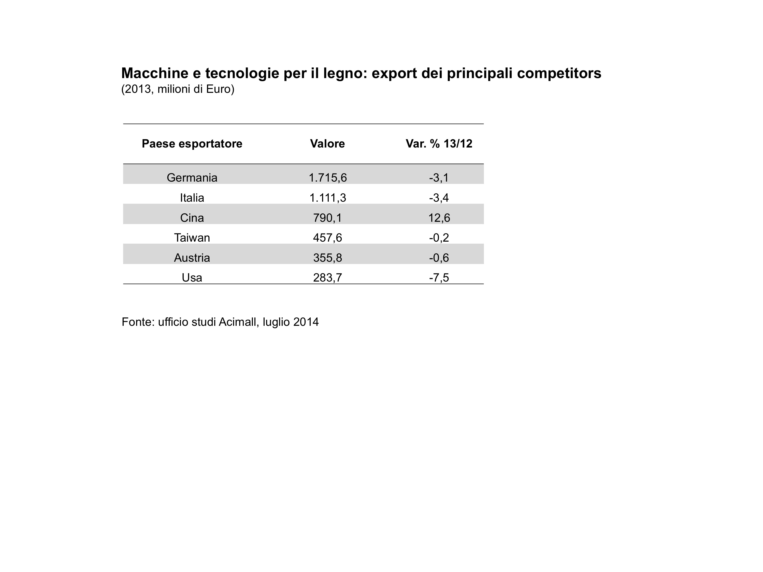 Dall’analisi dei dati sull’andamento dell’industria mondiale delle tecnologie per il legno, elaborati dall’Ufficio studi di Acimall, appare che i principali competitor mondiali hanno registrato un andamento negativo. Nello specifico sono calate le esportazioni della Germania (1.715 milioni di euro, -3,1% rispetto al 2012), per quanto compensate da un sempre forte mercato interno; calano del 3,1 per cento, attestandosi a 1.111 milioni, anche le esportazioni dall’Italia. L’export USA registra un -7,5% rispetto al 2012, per complessivi 283 milioni di euro; flessione, per quanto contenuta, per l’Austria (-0,6%, 355 milioni di euro) e per Taiwan (-0,2% per un export complessivo pari a 457 milioni di euro). Unica tendenza contraria si verifica in Cina, le cui esportazioni si attestano a 790 milioni di euro, il 12,6% in più rispetto al 2012, un risultato che vale il terzo posto nella classifica dei più forti esportatori mondiali di tecnologie per il legno. Gli Stati Uniti dimostrano di essere il primo Paese di destinazione per i produttori mondiali di tecnologie per il legno. Al secondo posto si attesta la Russia, mentre al terzo la Germania.