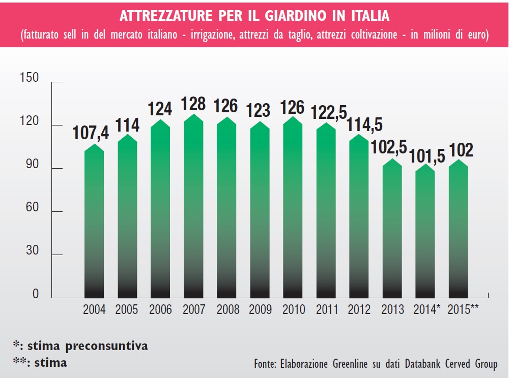 Nel pessimo 2013, anche le vendite di attrezzi per il giardinaggio sono diminuite del 10,4% attestandosi a 102,5 milioni di euro di giro d’affari. Purtroppo anche nel 2014 è previsto un ulteriore calo (- 1%) ma c’è una previsione di ripresa nel 2015 (+0,5%). È quanto emerge dal recentemente aggiornamento della Ricerca dedicata alle attrezzature per il giardinaggio, che comprende i prodotti per l’irrigazione, gli attrezzi manuali da taglio e quelli da coltivazione, realizzata da Databank Cerved Group. A trainare il calo del 2013 è stato il comparto dell’irrigazione, passato dai 58,5 milioni di euro del 2012 ai 52 del 2013, con una flessione dell’11,1%. Un calo continuato anche nel 2014, che dovrebbe chiudere con un -2,9% a 50,5 miliardi. Sul mercato dell’irrigazione oltre alla crisi dei consumi del 2013, ha gravato anche l’eccesso di piogge nel nord nella scorsa estate, dopo un inizio di stagione positivo. Migliore la “tenuta” degli attrezzi, che nel 2013 hanno perso il 9,8%, con un prestazione leggermente migliore degli attrezzi da taglio (- 9,3%) rispetto agli utensili da coltivazione (-10,3%). Ma soprattutto fanno segnare dei “numeri” positivi nel previsionale 2014 e per il 2015: +1% nel 2014 e +0,8% nel 2015.