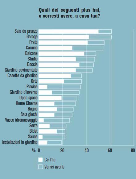 Le nostre famiglie stanno cambiando, quindi si trasformano anche le nostre case: il 77% degli intervistati vuole adattare la propria casa per mutate esigenze familiari (come l'arrivo di un figlio) o per tendenze moderne, come il lavorare da casa o il trascorrere sempre più il proprio tempo libero in casa. Oggi, quasi la metà (47%) delle persone ha, o vorrebbe, un ufficio in casa, e più di un quarto (27%) ha, o vorrebbe, una sala giochi. Gli interventi di miglioramento più desiderati (ma non sempre attuabili nella realtà…) sono: Piscine 28%; Camini 26%; Verande 23%; Vasche idromassaggio 22%. Più di due terzi degli europei (68%) sta facendo modifiche in casa per aumentarne il valore. Si tratta di un grande cambiamento dal 17% registrato nel 2012. Nei prossimi 12 mesi le priorità principali degli europei saranno Pittura e decorazione (40%); Giardinaggio (21%); Illuminazione (18%); Interventi di ristrutturazione in cucina (17%).