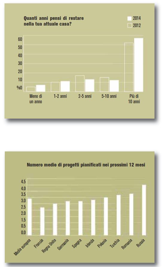 Gli europei sono più propensi a spendere per i miglioramenti della casa (47%) rispetto ad altre opzioni come ad esempio una macchina (29%) o una vacanza (44%). In media, gli europei stanno elaborando tre progetti nei prossimi 12 mesi, con la Russia che ha in programma il numero maggiore (4) e la Francia quello minore (2,2). Le prime cinque voci di spesa previste per la casa nel corso dei prossimi 12 mesi saranno pittura - decorazione (40%), interventi in giardino (21%) e illuminazione (18%), seguiti da una nuova cucina (17%) e arredamento in generale (18%). Interessante notare come l’acquisto di prodotti per la casa venga stabilito principalmente dal fattore prezzo (73%), seguito dalla qualità (56%).