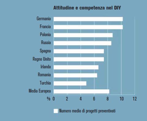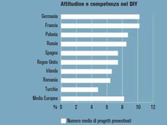 4) L’attitudine dei cittadini europei verso il fai da te e la loro capacità di intraprendere determinati lavori, varia enormemente da Paese a Paese. Ad esempio, i tedeschi sono i più propensi a intraprendere un importante lavoro strutturale, mentre in Turchia ci sono i bricoleur meno esperti. Gli inglesi contnuano a essere “i giardinieri d'Europa”, mentre i polacchi sono i più abili nell'installazione di un sistema di riscaldamento centralizzato.