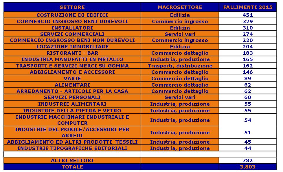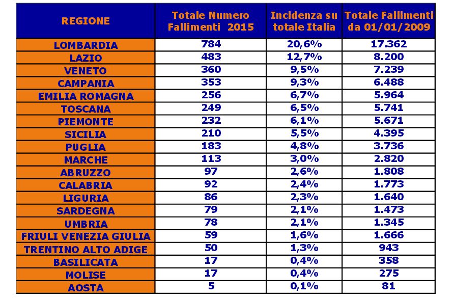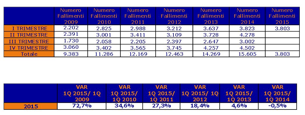 Nel 2015 si ferma la corsa ai fallimenti in Italia: nei primi tre mesi dell’anno si è interrotta la preoccupante crescita di imprenditori che hanno visto fallire la propria attività, infatti i fallimenti sono stati 3.803 (-0,5% rispetto allo stesso periodo nel 2014), un segnale che va interpretato positivamente se si guarda il trend che si era instaurato e che vedeva un costante aumento di casi di fallimento.