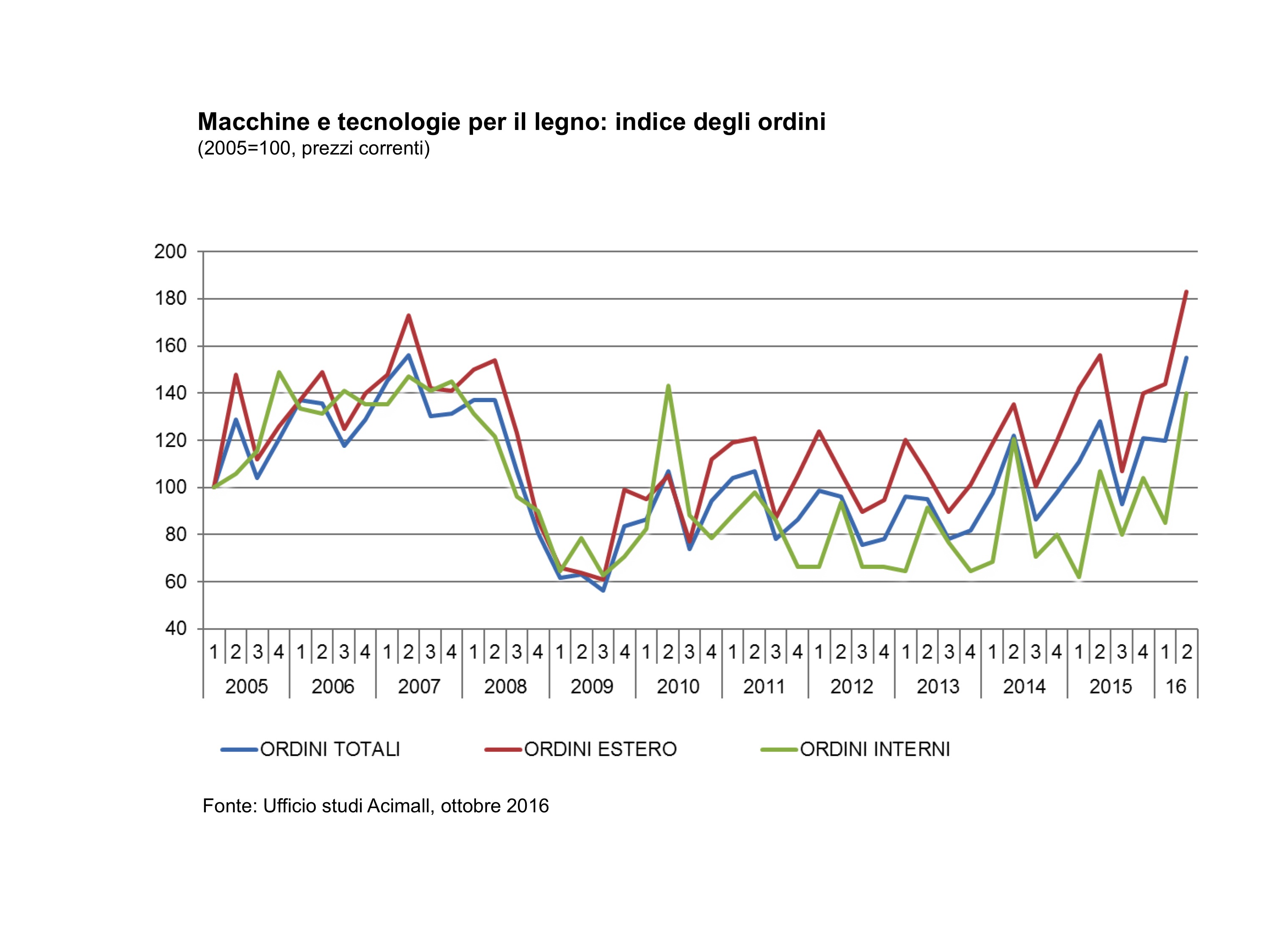 Dalla consueta indagine congiunturale realizzata dall’Ufficio studi di Acimall, l’Associazione costruttori italiani di macchine e accessori per la lavorazione del legno, emerge che nel secondo trimestre 2016 gli ordini sono cresciuti del 21,2% rispetto all’analogo periodo dello scorso anno. Il trend positivo degli ultimi periodi, dunque, prosegue, sempre determinato dal traino dei mercati esteri, i cui ordini crescono del 17,2%. Molto buona, in termini percentuali, anche la dinamica della domanda italiana (+30,4%), che però risente ancora e fortemente dei record negativi degli anni di più profonda crisi.