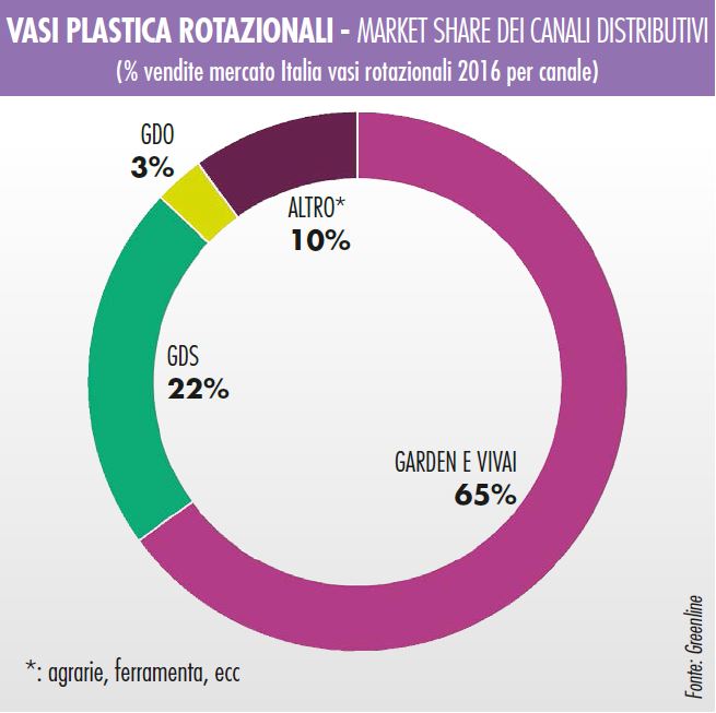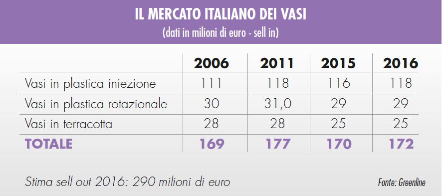 La maggior parte delle imprese intervistate è d’accordo sul fatto che nel 2016 le vendite di vasi siano rimaste stabili rispetto al 2015: noi stimiamo una leggera crescita dell’1%, trainata in particolare dai vasi iniezione, mentre sono stabili terracotta e rotazionale. Pari a un fatturato di 172 milioni di euro e un giro d’affari di 290 milioni di euro con prezzi al consumo. “Premesso che questo mercato manca di dati certi – sottolinea giustamente Fabio Zanardi, sales director di Plastecnic –, la mia sensazione è che ci si trovi in un momento di sostanziale stabilità dei grandi numeri. Alcuni canali di vendita hanno sofferto più di altri e ci sono stati probabilmente travasi di fatturato da un canale all’altro, ma in sostanza la sensazione è che nel 2016 si siano venduti più o meno gli stessi vasi che nel 2015”. “L’andamento delle vendite di vasi in Italia nel 2016 è stato tendenzialmente stabile rispetto al 2015", conferma anche Maurizio Reversi, sales area manager di Serralunga.