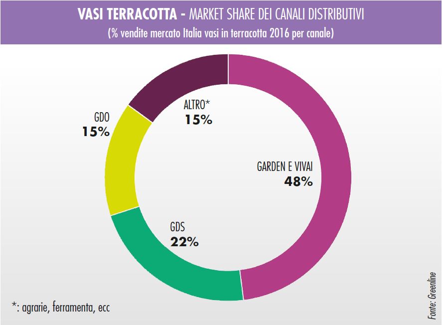 “L’andamento delle vendite di vasi in Italia nel 2016 è rimasto stabile rispetto all’anno precedente",spiegano dall’ufficio marketing di Arca. "Come canali distributivi nel mondo dei vasi, i nostri dati riportano un lieve ribasso percentuale dei garden center e un conseguente aumento della quota di mercato di GDS e GDO che rimarrà persistente anche nei i prossimi anni”.