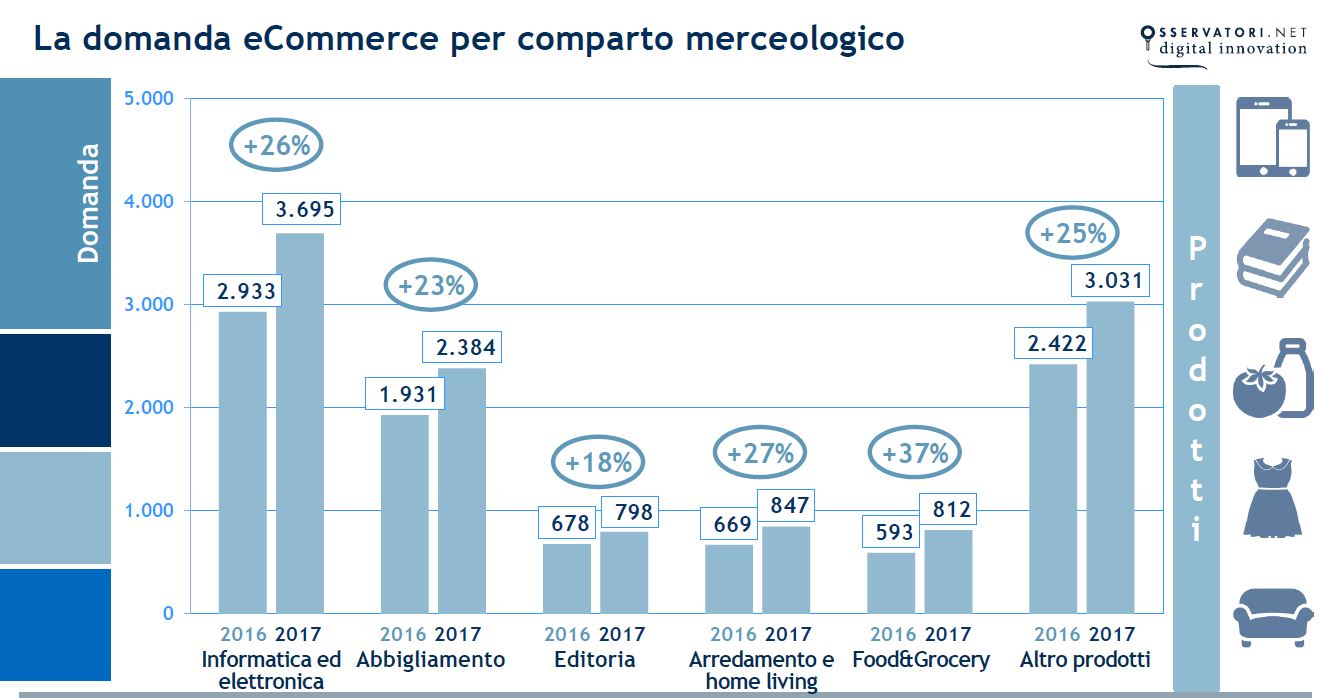 “Gli acquisti e-commerce di prodotto (+25%) cresceranno nel 2017 ben più di quelli di servizio (+8%) e, per la prima volta nella storia dell’e-commerce italiano, il mercato dei prodotti varrà tanto quanto quello dei servizi (11,5 miliardi di euro). Il peso dell’e-commerce sul totale acquisti retail degli italiani raggiungerà il 5,6%. Il Food&Grocery si conferma essere uno dei comparti più performanti, grazie a una crescita del 37%, insieme con l’Arredamento e Home Living (+27%) e all’Informatica ed Elettronica (+26%)" afferma Riccardo Mangiaracina, Responsabile Scientifico dell'Osservatorio eCommerce B2c Netcomm - School of Management del Politecnico di Milano.