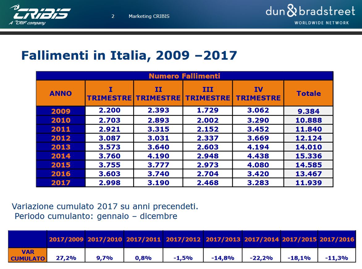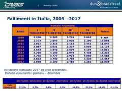 Questo quanto emerge dall’ultimo aggiornamento dell'Analisi dei fallimenti in Italia realizzata da CRIBISed aggiornata al 4Q 2017.