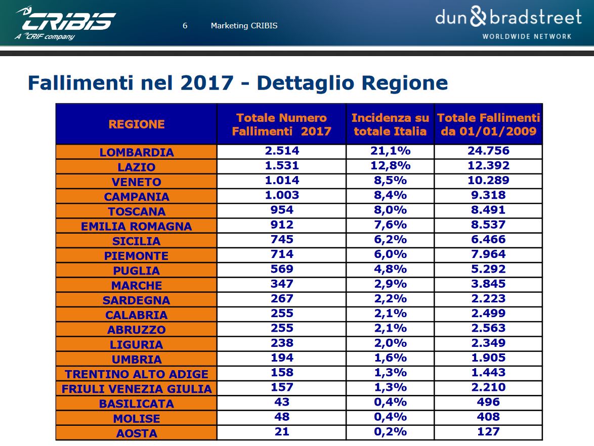A livello territoriale la distribuzione dei fallimenti è legata alla densità di imprese attive nelle diverse aree del Paese: la Lombardia, con 2.514 casi nel corso del 2017, e una incidenza sul totale Italia del 21.1%, si conferma la regione con il maggior numero di fallimenti, mentre la seconda regione più colpita è il Lazio, con 1.531 casi e un’incidenza sul totale Italia del 12.8%, seguita dal Veneto (1.014 aziende fallite e relativa incidenza dell’8.5%).
