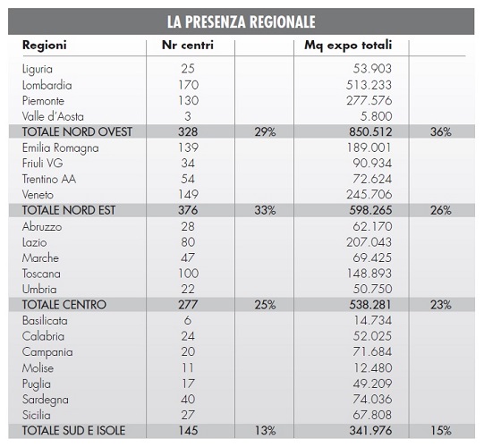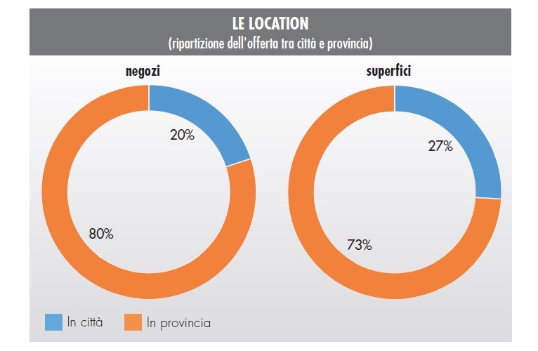 Le location nelle città sono in aumento nel 2017 e rappresentano il 27% dello spazio espositivo totale (era il 26% nel 2016). Il restante 73% è ubicato nelle periferie e rappresenta l’80% del numero dei negozi.