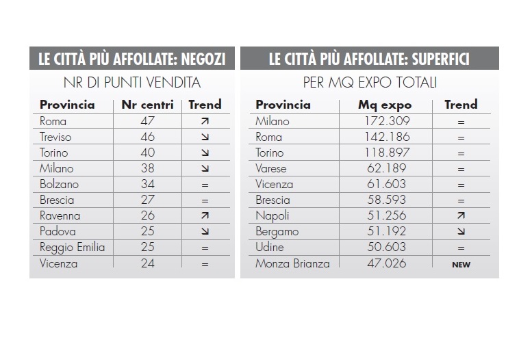 Nella classifica delle città, Roma passa dal quarto al primo posto con 47 negozi, superando Treviso, Torino e Milano. Ravenna passa dall’ottava alla settima posizione, sorpassando Padova. Analizzando le metrature, Milano, Roma e Torino sono saldamente ai primi posti con oltre 100.000 mq. Napoli sorpassa Bergamo e sale al settimo posto, mentre Monza entra in decima posizione al posto di Bolzano.