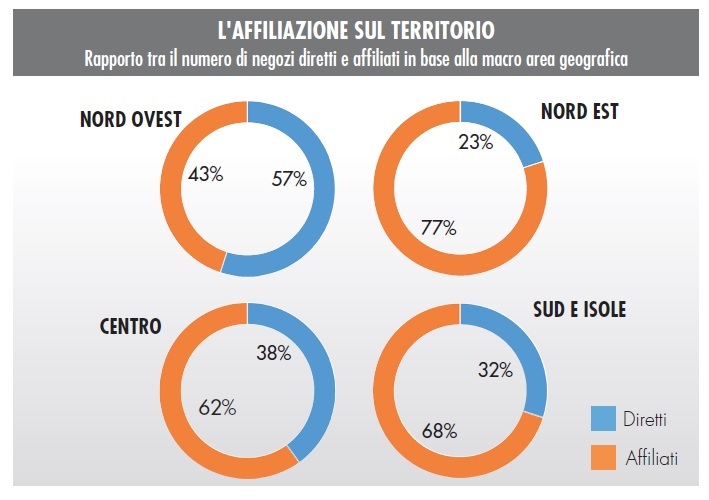L’area con l’incremento maggiore è quella del centro Italia: nel 2017 ha superato la media italiana sia per il numero di negozi (25% del totale), sia per le metrature (23%). Calano le regioni del nord ovest e del nord est, mentre rimane stabile il sud. Nei centri bricolage, il 2017 ha visto un maggior sviluppo di centri diretti rispetto agli affiliati: rappresentano il 59% dei centri diy totali, erano il 58% nel 2016.