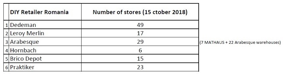 Pertanto, nella top five delle catene bricolage in Romania nel 2017, ci sono le rumene Dedeman e Arabesque (che ha lanciato lo scorso anno un secondo brand, MatHaus, il marchio retail dell'azienda) e tre internazionali: Leroy Merlin, Hornbach e Brico Depot by Kingfisher.