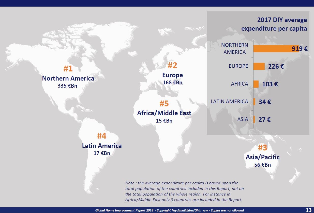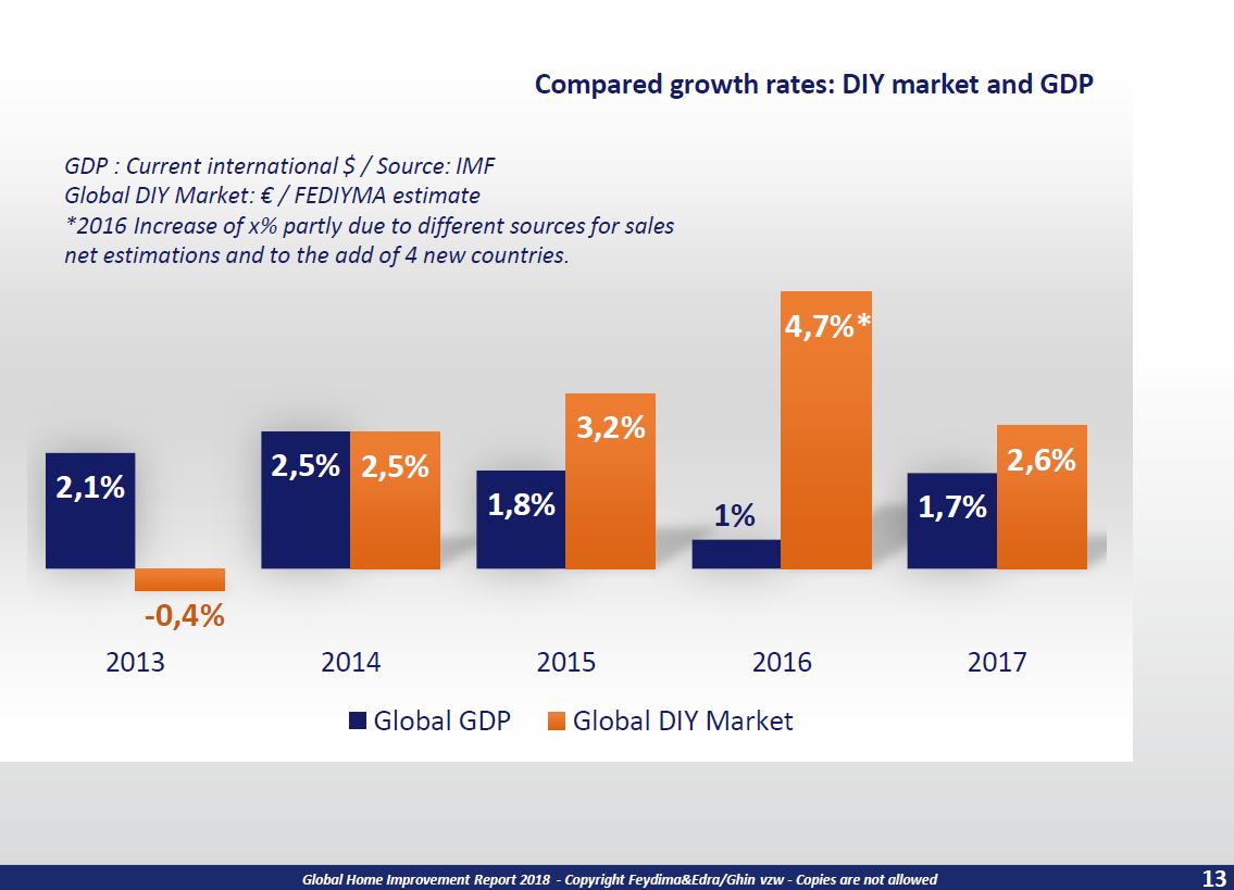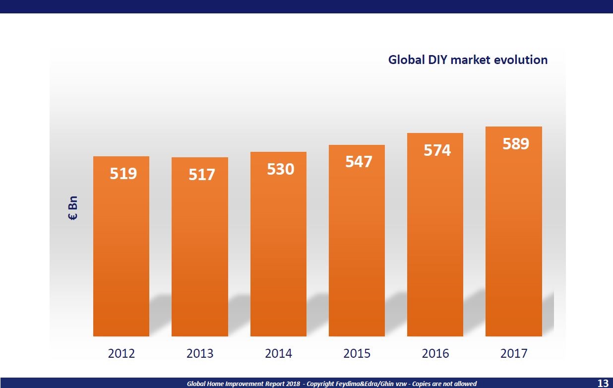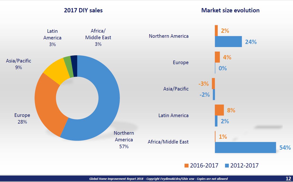 Nel 2017, il fatturato del mercato mondiale del DIY ha raggiunto i 589 miliardi di euro, con un incremento del 2,6% rispetto allo scorso anno. Il Nord America e l'Europa, insieme, rappresentano (con 503 mld) circa l'85% dell'intero mercato, sebbene la loro popolazione congiunta rappresenti solo il 15% di quella mondiale. E' quanto emerge dalla Global Home Improvement Report Fediyma, l'associazione europea dei fabbricanti di DIY.