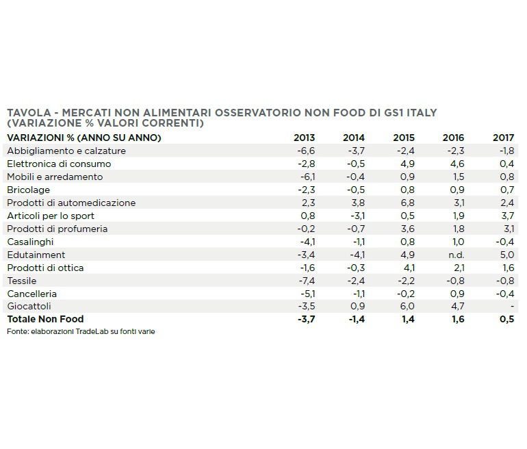 Il mercato che più ha risentito di questa dinamica è quello dei casalinghi, che ha chiuso il 2017 con 4,4 miliardi di euro di vendite (-0,4% rispetto all’anno precedente, +0,2% nell’ultimo quinquennio). Una sostanziale stabilità che nasconde però trend molto diversi nei diversi segmenti di questo settore.