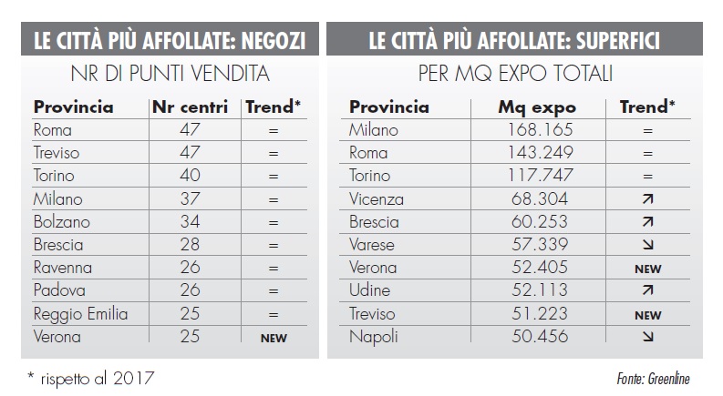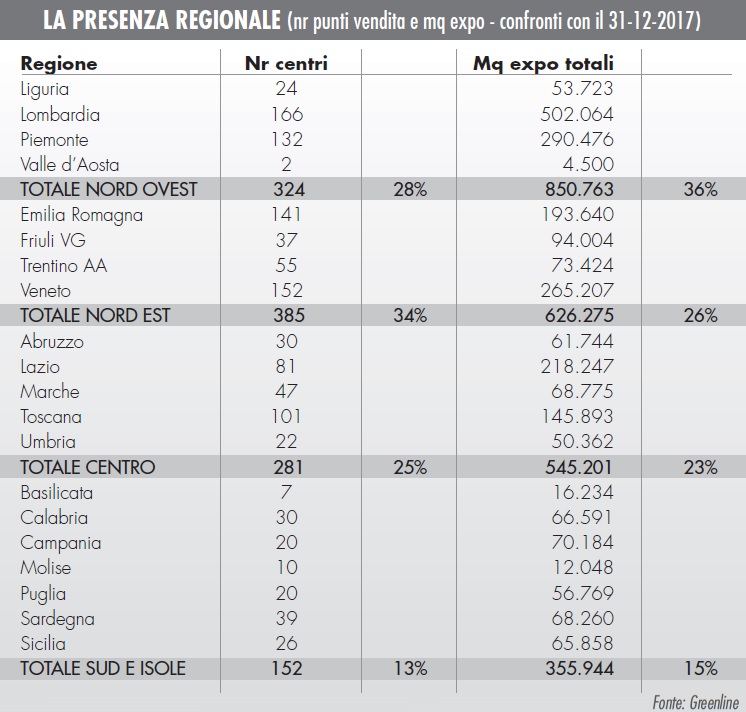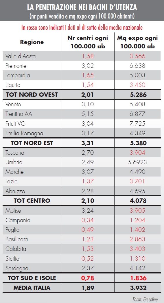 Poiché le varie aree hanno popolazioni differenti, per poter fare dei paragoni è opportuno analizzare il numero di abitanti in rapporto ai punti vendita. Possiamo così evidenziare come nel 2018 ci siano in Italia 3.932 mq espositivi ogni 100.000 abitanti, con una crescita del 3,1% rispetto ai 3.814 mq del 2017.