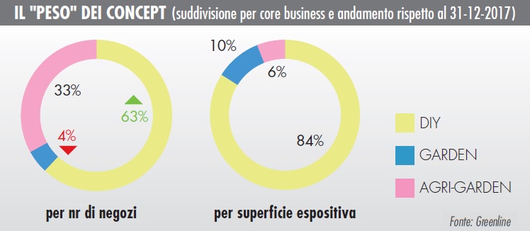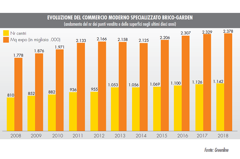 La gran parte di questo “universo” è rappresentata dai centri bricolage, che costituiscono il 63% dei punti vendita (era il 62% nel 2017) e l’84% delle superfici espositive. Diminuisce invece l’importanza dei garden center, che scendono al 4% dei negozi (erano il 5% nel 2017) e al 10% delle metrature.