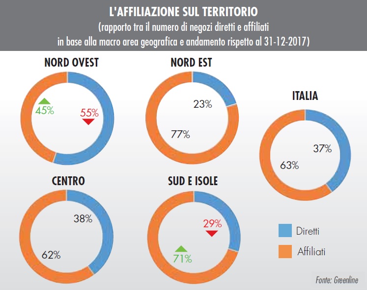 Per punto vendita “diretto” intendiamo i negozi di proprietà del gruppo distributivo; per “affiliato”, intendiamo i negozi di proprietà di imprenditori privati, che aderiscono a formule di associazionismo distributivo, come il franchising, o di affiliazione a gruppi d’acquisto e consorzi.