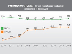 Come era già successo nel 2017, anche nel 2018 la rete di punti vendita dei gruppi distributivi specializzati nel brico-garden ha dimostrato una maggiore dinamicità nel secondo semestre. Mentre nei primi sei mesi dello scorso anno il tasso di crescita era fermo al +0,2%, il 2018 ha infatti chiuso con un +1,4% dei punti vendita e un +2,1% delle metrature, pari a 1.142 negozi e 2,378 milioni di mq. Tassi di crescita apparentemente limitati, ma è interessante rilevare come nel lungo periodo, rispetto cioè a 10 anni fa (nel 2008, anno di inizio della crisi finanziaria), i negozi siano aumentati del 41% (+332 nuove aperture) e le metrature del 33,7%.