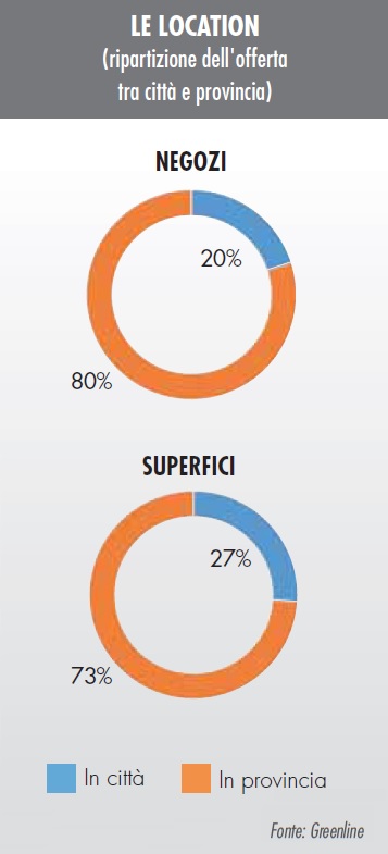 Nella classifica delle città, Roma si conferma al primo posto con 47 negozi, affiancata da Treviso e davanti a Torino (40 store) e Milano (37). Entra nella top ten Verona al posto di Vicenza. Analizzando invece le metrature, Milano, Roma e Torino sono saldamente ai primi posti con oltre 100.000 mq. Buona performance di Vicenza e Brescia che superano Varese, passata dal 4° al 6° posto. Bene Udine che guadagna 1 posizione, male Napoli che ne perde 3. Entrano nella top ten Verona e Treviso, al posto di Bergamo e Monza. Segnaliamo inoltre che nel 2018 i negozi cittadini rappresentano il 27% delle metrature. Il restante 73% è ubicato nelle periferie e rappresenta l’80% del numero dei negozi.