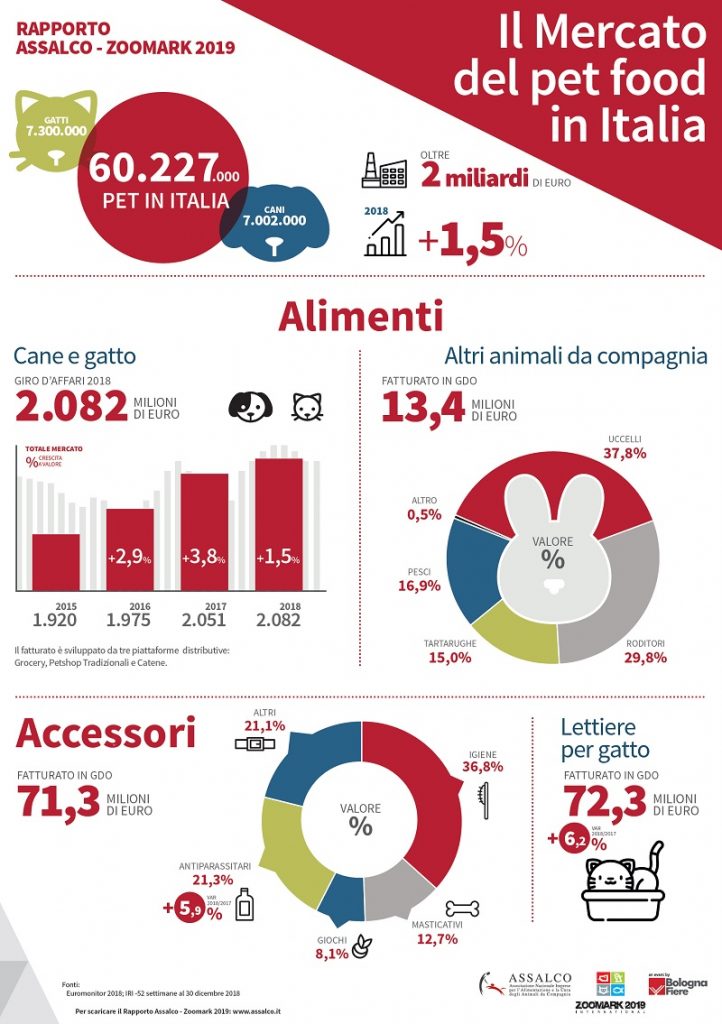 Nel corso della fiera Zoomark di Bologna (6-9 maggio), è stato presentato il Rapporto Assalco-Zoomark 2019 che ha evidenziato una crescita del mercato pet food per cani e gatti nel 2018 dell’1,5% con un giro d’affari di 2.082 milioni di euro. Il Rapporto di quest’anno ha presentata una indagine Doxa dedicata alla percezione della popolazione italiana verso gli animali d’affezione.