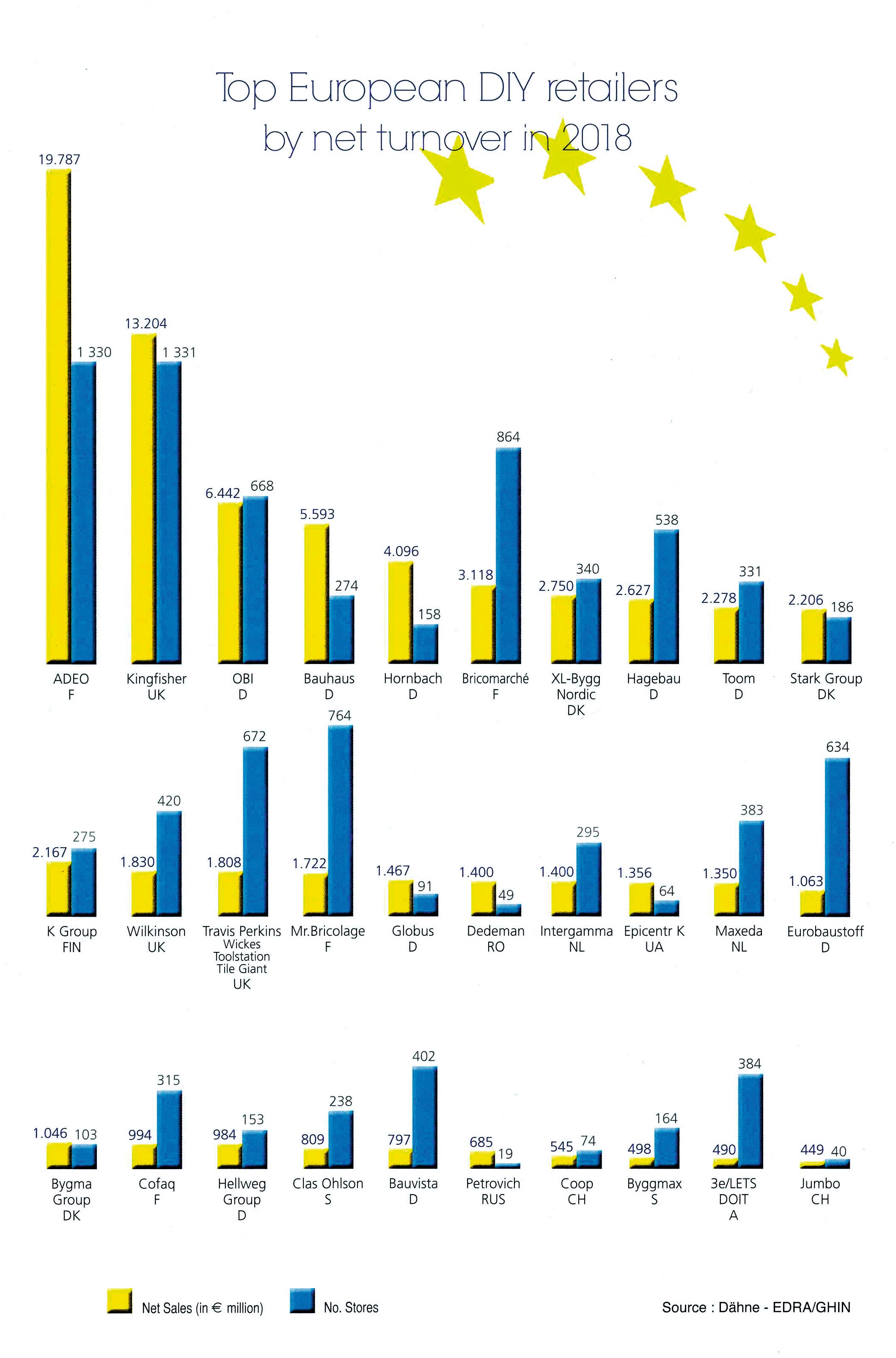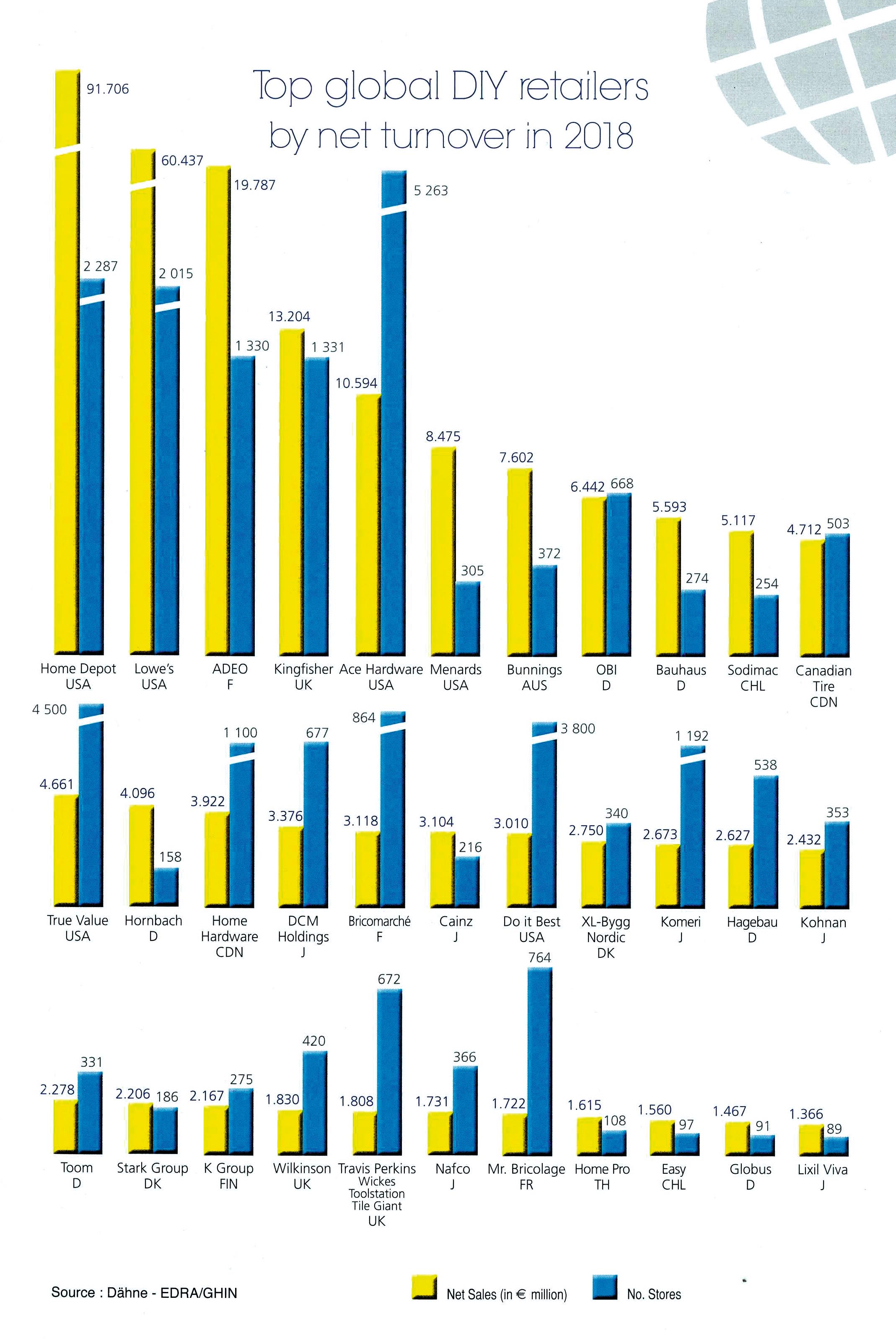 Nella Top10 europea, la palma d’oro se l’aggiudica proprio la francese Adeo, con quasi 20 mld di euro di fatturato, seguita sul podio dalla britannica Kingfisher e dalla tedesca Obi, con rispettivamente 13,2 e 6,4 mld di euro di fatturato. La Top10 europea è completata da ben altre quattro insegne tedesche (Bauhaus, Hornbach, Hagebau e Toom), un’altra francese (Bricomarché) e la danese XL-Bygg Nordic.LA TOP10 NEL MONDO