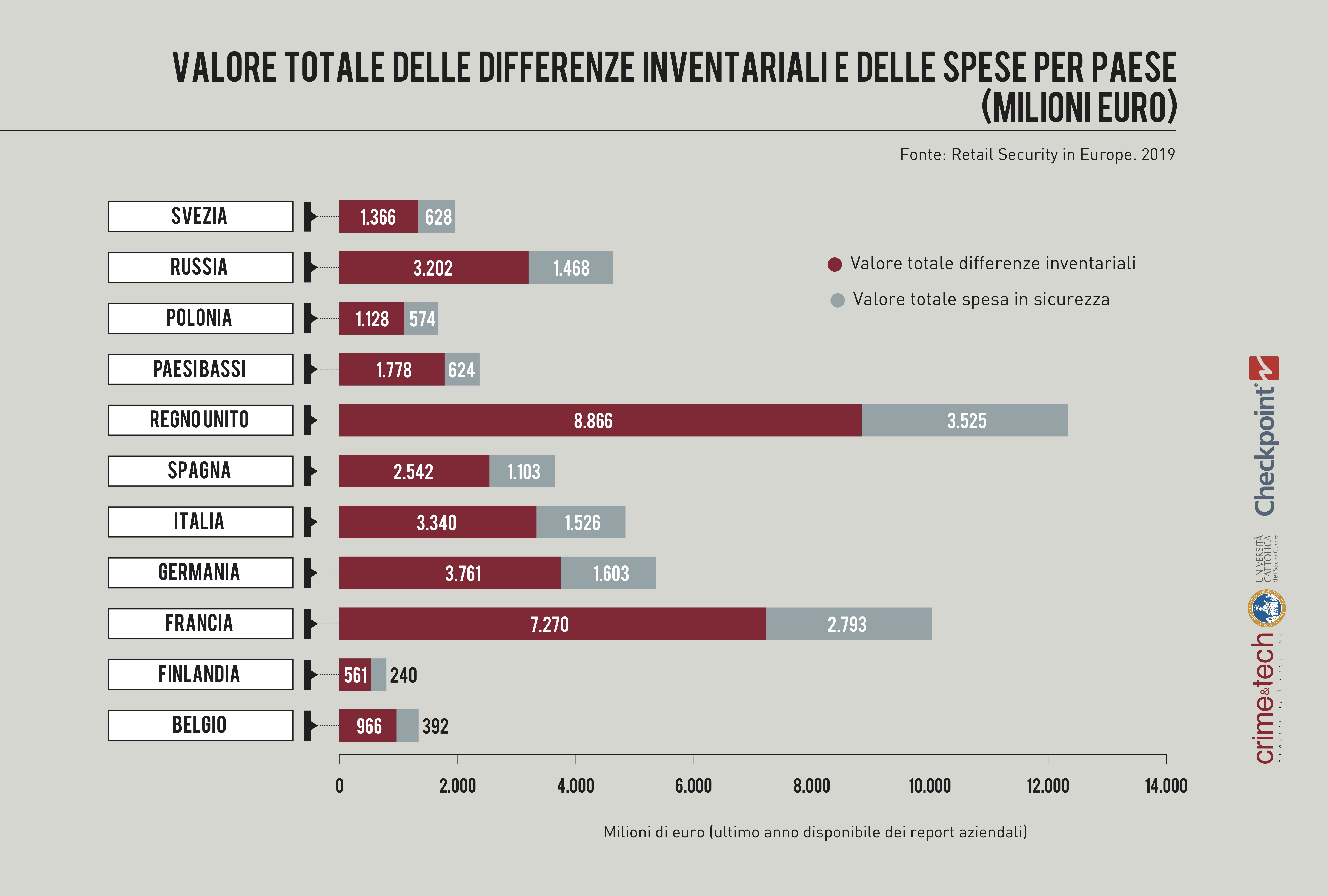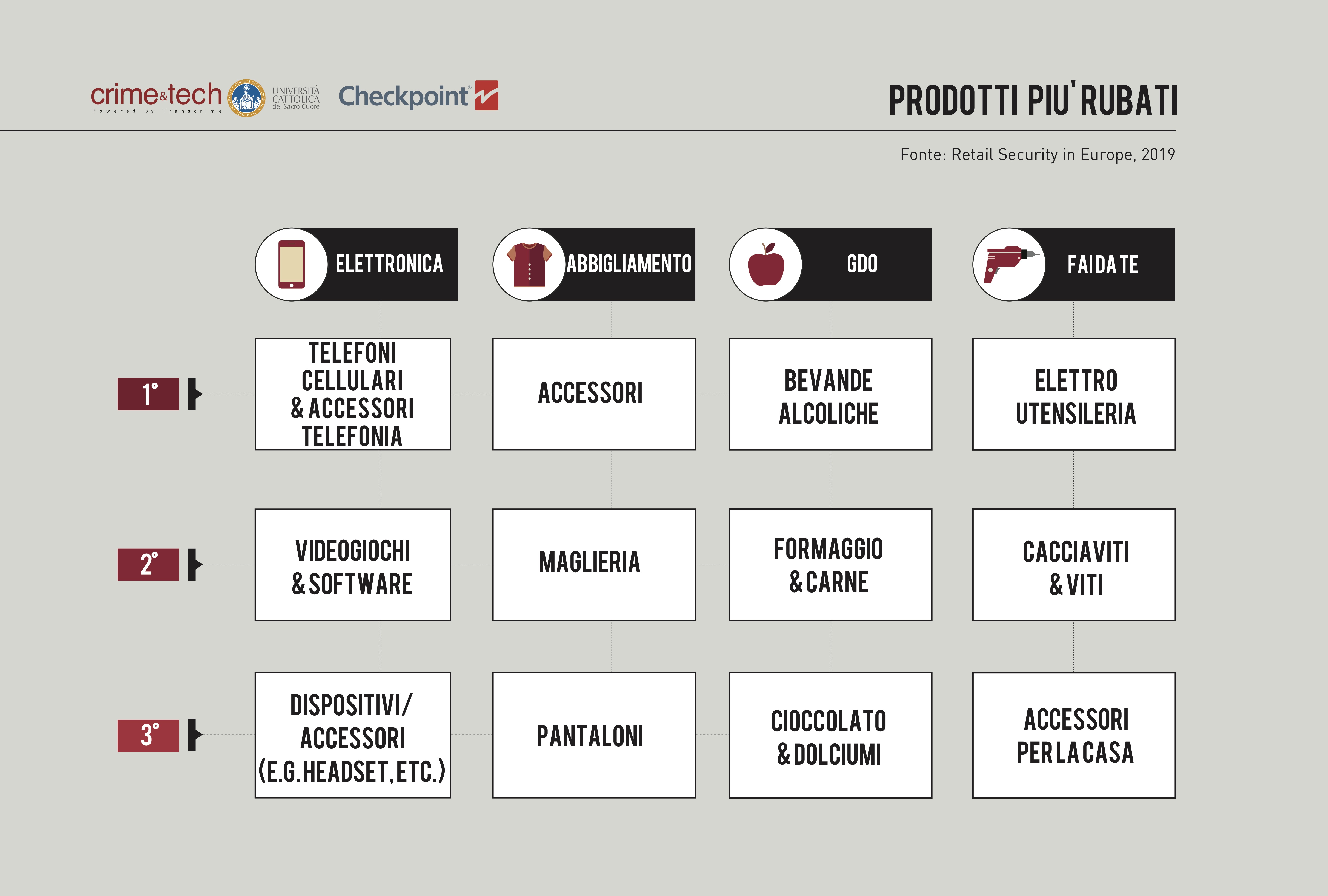 Lo studio rivela quali sono i prodotti più rubati per valore nel settore retail; tra i prodotti alimentari, i primi cinque sono bevande alcoliche, formaggi, carne, dolci e pesce in scatola. Nel settore dell’abbigliamento sono accessori, maglieria, pantaloni e camicette i prodotti più rubati, mentre telefoni cellulari e accessori sono in cima alla lista rispettivamente nel settore dell’elettronica e tra gli attrezzi di alto valore nei negozi di fai da te (nella singola classifica, come detto, comandano gli elettroutensili, seguiti dagli utensili manuali (in particolare i cacciavite), le viti e gli accessori per la casaDifferenze inventariali: il quarto retailer in Europa
