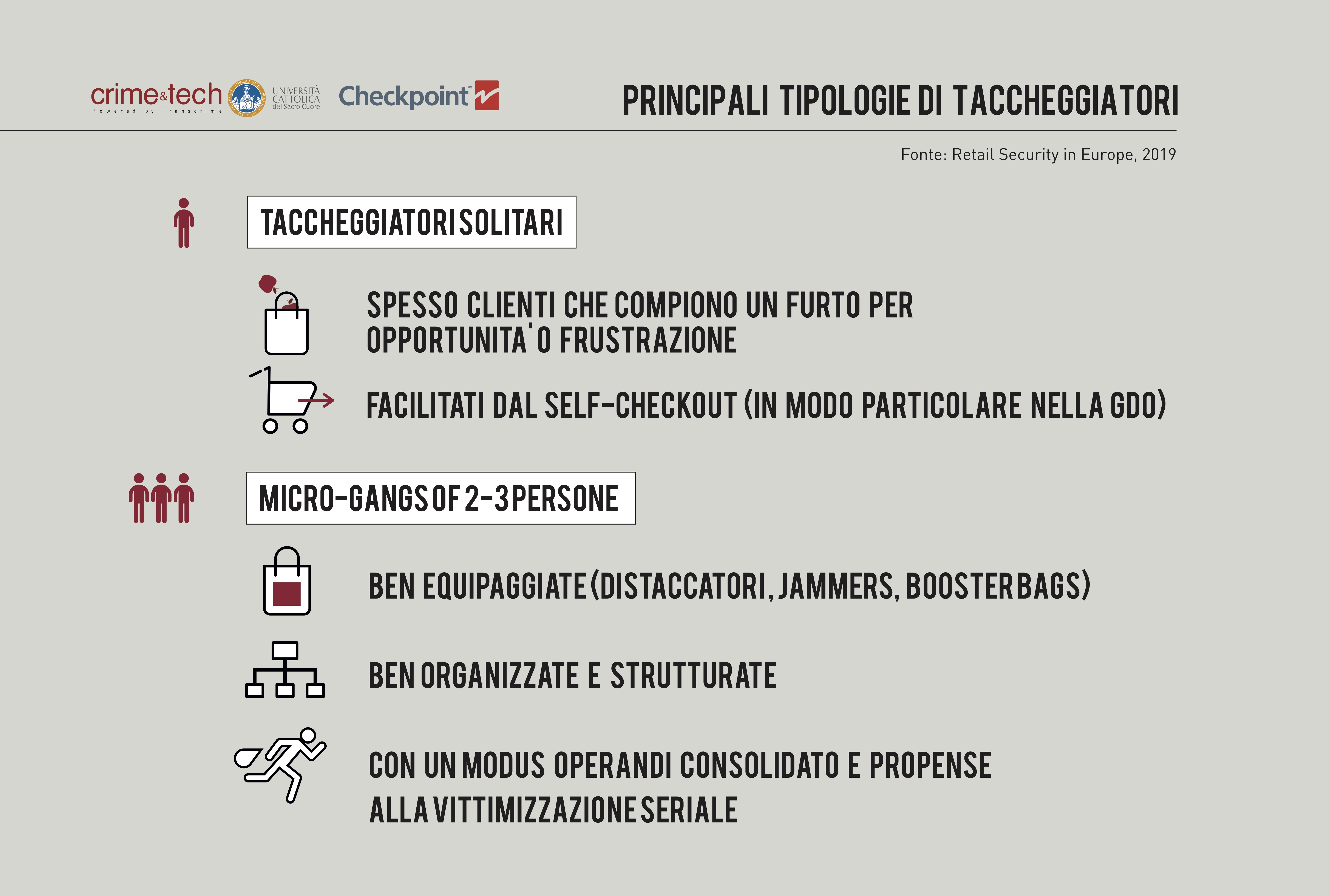 - Il “grab and run" continua ad essere il modus operandi maggiormente adottato dai taccheggiatori, ma vengono utilizzate frequentemente anche le borse schermate, che impediscono ai prodotti muniti di etichetta antitaccheggio di essere rilevati dalle tecnologie EAS meno recenti.