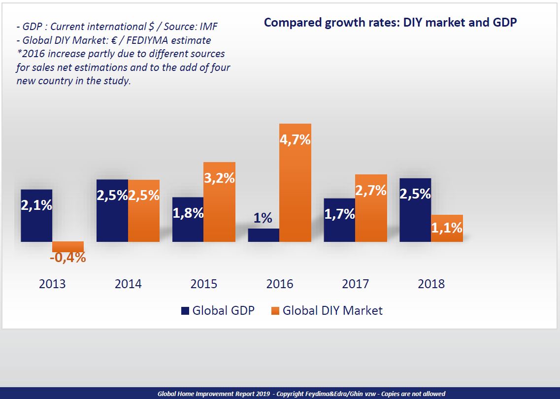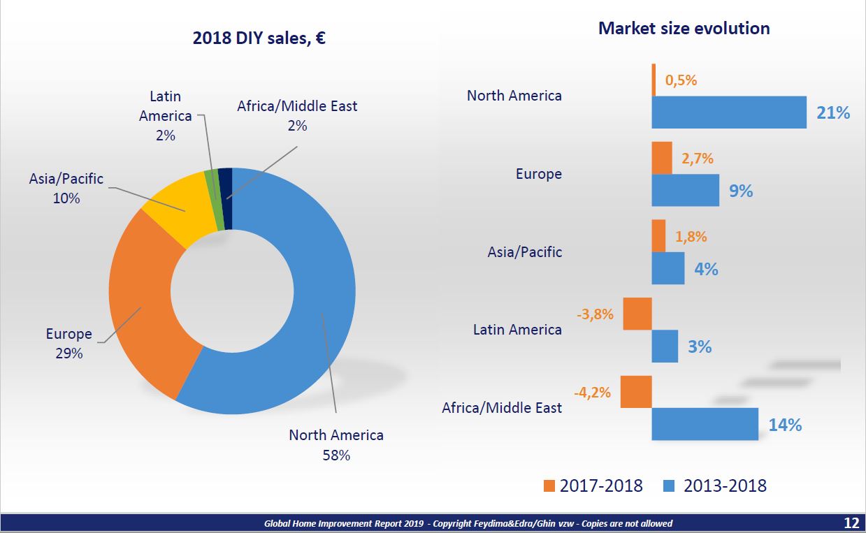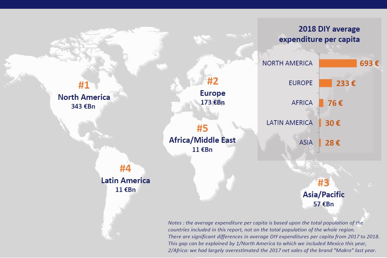 Nel 2018, il fatturato del mercato mondiale del fai da te ha raggiunto come detto 594 miliardi di euro, con un incremento dell'1,1% rispetto allo scorso anno. Il Nord America e l'Europa insieme rappresentano circa l'87% del mercato totale, sebbene la loro popolazione congiunta rappresenti solo il 17% della popolazione mondiale. Il fatturato dei mercati DIY di questi due continenti ammontano a 516 miliardi di euro.