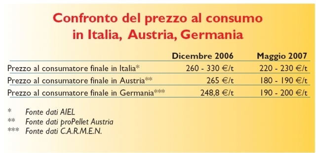 | Dicembre 2006 Maggio 2007 Prezzo al consumatore finale in Italia* 260 -330 €/t 220 - 230 €/t Prezzo al consumatore finale in Austria** 265 €/t 180 - 190 €/t Prezzo al consumatore finale in Germania*** 248,8 €/t 190 -200 €/t | |