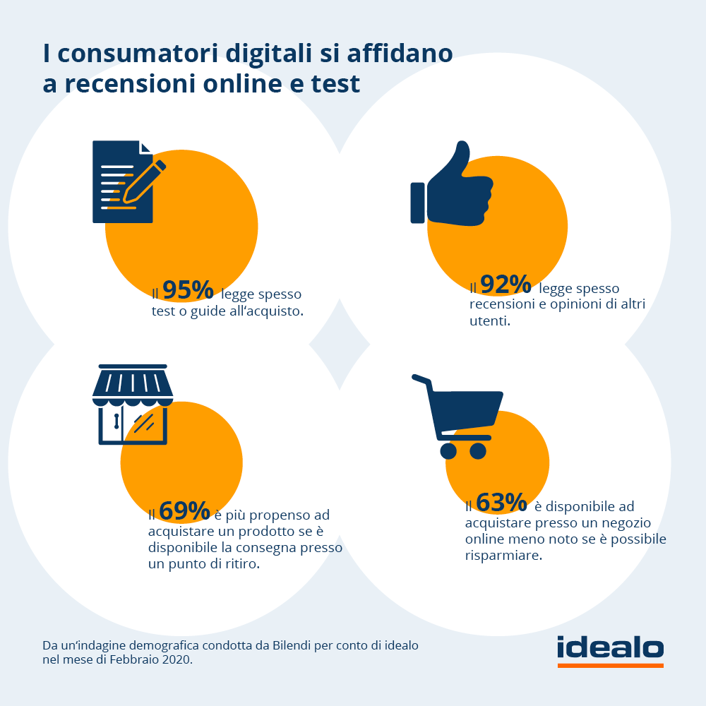 L’analisi effettuata ha rivelato come il 95%degli e-consumer italiani legge spesso test o guide all’acquisto. Il 92%, invece, legge spesso recensioni e opinioni di altri utenti. Il 69% è più propenso ad acquistare un prodotto se è disponibile la consegna presso un punto di ritiro mentre il 63% è disponibile ad acquistare presso un negozio online meno noto se è possibile risparmiare.Le possibilità di risparmio del canale online e la fluttuazione dei prezzi nel corso dell’anno