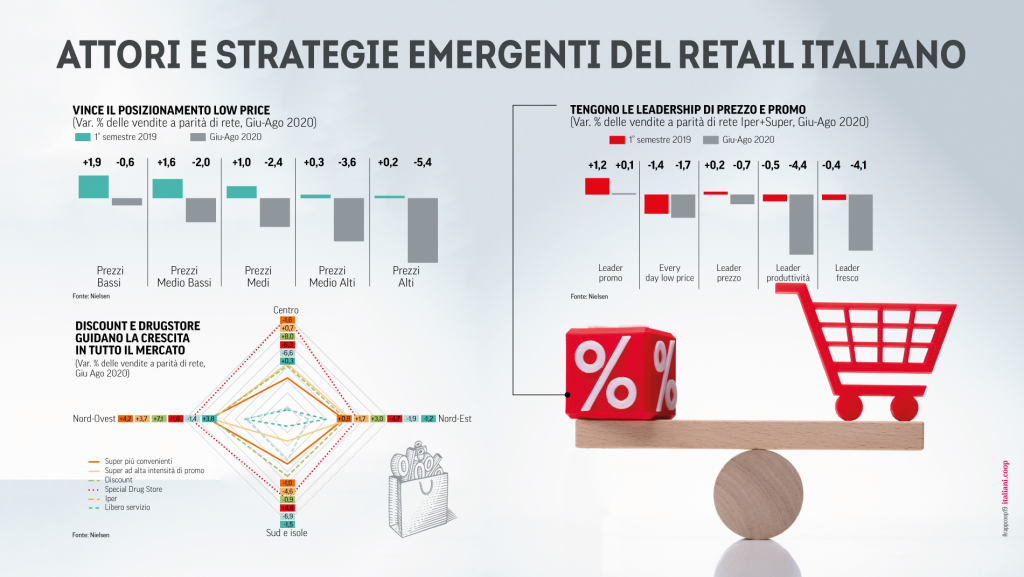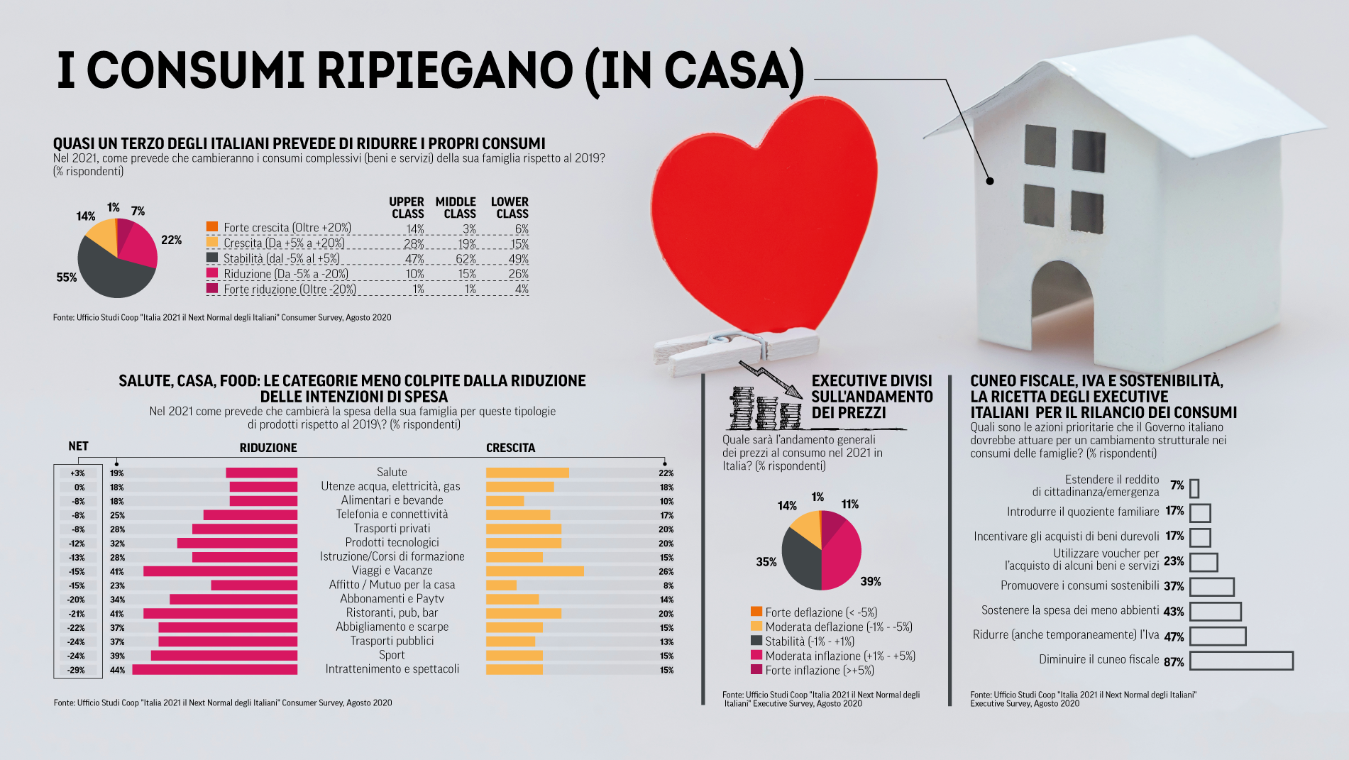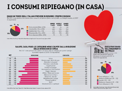 La casa come salvagente a cui tenersi stretti fa il paio con un’altra costante che distingue ancora nel postcovid gli italiani dai cugini europei: il cibo. Alla spesa alimentare, pur nell’emergenza e in una evidente contrazione generalizzata degli acquisti, gli italiani non rinunciano e solo il 31% dichiara di voler acquistare prodotti di largo consumo confezionato più economici a fronte di un 37% della media europea; un dato decisamente inferiore al 50% registrato lo scorso anno e al 57% del 2013 (anno in cui eravamo in piena crisi economica con un Pil a -1,8%). E anche a emergenza sanitaria finita solo il 18% dice di voler acquistare prodotti più economici. Guardando dentro al carrello si nota una straordinaria inversione di tendenza rispetto alla fotografia scattata appena un anno fa dal RapportoCoop2019. Allora era fuga dai fornelli, un fenomeno che in realtà continuava in progressione costante tanto da dimezzare in 20 anni il tempo passato a cucinare ogni giorno ridotto allora a appena 37 minuti. Complice il lockdown invece gli italiani hanno rimesso le mani in pasta e anche nel postcovid il cook@home è una costante che spiega la forte crescita nelle vendite degli ingredienti base (+28.5% in GDO su base annua) a fronte della contrazione dei piatti pronti (-2,2%). Supportati o meno da aiuti tecnologici (la vendita dei robot da cucina ha fatto registrare a giugno +111% rispetto all’anno prima), il 30% dedicherà ancora più tempo alla preparazione del cibo e il 33% sperimenterà di più. 1 su 3 lo farà per “mangiare cose salutari”, ma c’è anche un 16% che lo ritiene un modo per mettersi al riparo da possibili occasioni di contagio. La preparazione domestica dei cibi è probabilmente anche la nuova strategia degli italiani per non rinunciare alla qualità e contemporaneamente alleggerire il proprio budget familiare.