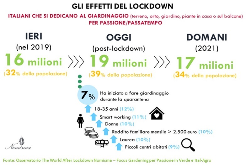 Immaginando un ritorno alla normalità, secondo le previsioni saranno 17 milioni (il 34% della popolazione) gli italiani che continueranno a coltivare la passione per il verde, prendendosi cura di un terreno, di un orto o dedicandosi alla manutenzione del giardino o delle piante in casa e in balcone.